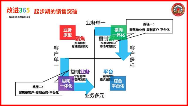 改进咨询的观点:起步期以销售能力建设为主,但销售业绩的好坏并不完全由销售部门决定的,跟其他部门包括生产、供应链、运营等部门的整体配合关系很大,在这个阶段,多个部门协同,快马加鞭、乘风破浪,迅速站到行业的头部阵营尤为重要