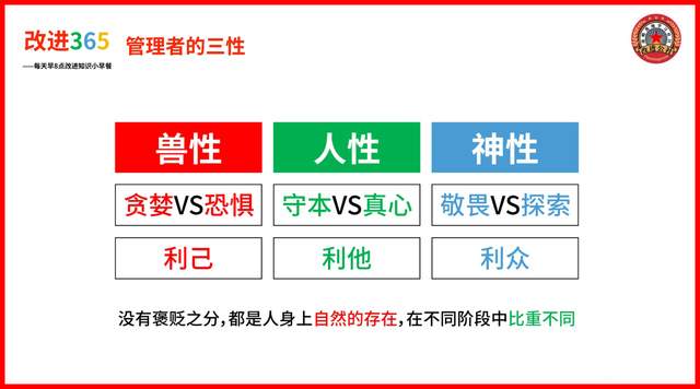 改进咨询的核心观点:一个管理者在成长的过程中总会经历兽性、人性和神性的三个成长阶段,工作和生活正像一面自我修行的镜子,能反照出自己的长处和短板,只要带着神性化的追求,践行人性化的原则,就会不断降低兽性化对我们管理的影响,逐步建立起更加强大的领导力。