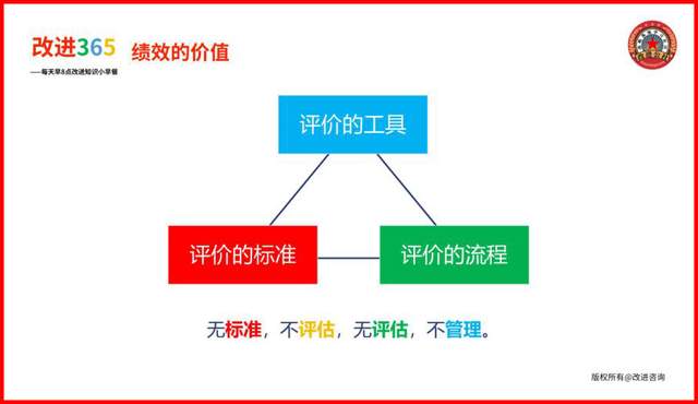 总之,改进思想认为:绩效管理既不是洪水猛兽,可能导致企业走向衰败的万丈深渊,绩效管理也不是包治百病的灵丹妙药,能够救助企业于水深火热之中,绩效管理就是在企业发展中的极其正常的组成部分,能够帮助企业建立业绩标准、执行业绩标准并优化业绩标准,完善的绩效管理系统就好比给企业增强了免疫系统,能够形成“责权利”的内部循环,通过阶段性的绩效考核不仅可以用于评估和奖惩,更是为了组织效益的建设和改进。