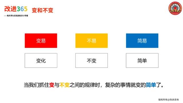 中国古人研究变化是从观察日月星辰的转换开始的,那时候的人没有微信和抖音,更多的时间用于耕耘大地和仰望星空。在日积月累的实践和观察中,古人既看到了斗转星移、风吹雨打、霜寒日晒的变化,也看到了天地运行、寒暑交替、物极必反的规律。人们将这种日月轮转的过程总结为“易”字,来表达“定数”与“变数”之间的辩证关系。“易”包含了“三易”,一是变易,说的是“变化”,二是不易,说的是“不变”,三是简易,说的是“简单”,当我们能够把握“变”与“不变”之间的规律时,事情就变的简单了。