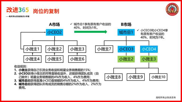 3、城市总经理,负责在一个城市进行市场规划和小CEO的开发培养,对城市的业绩结果负责。